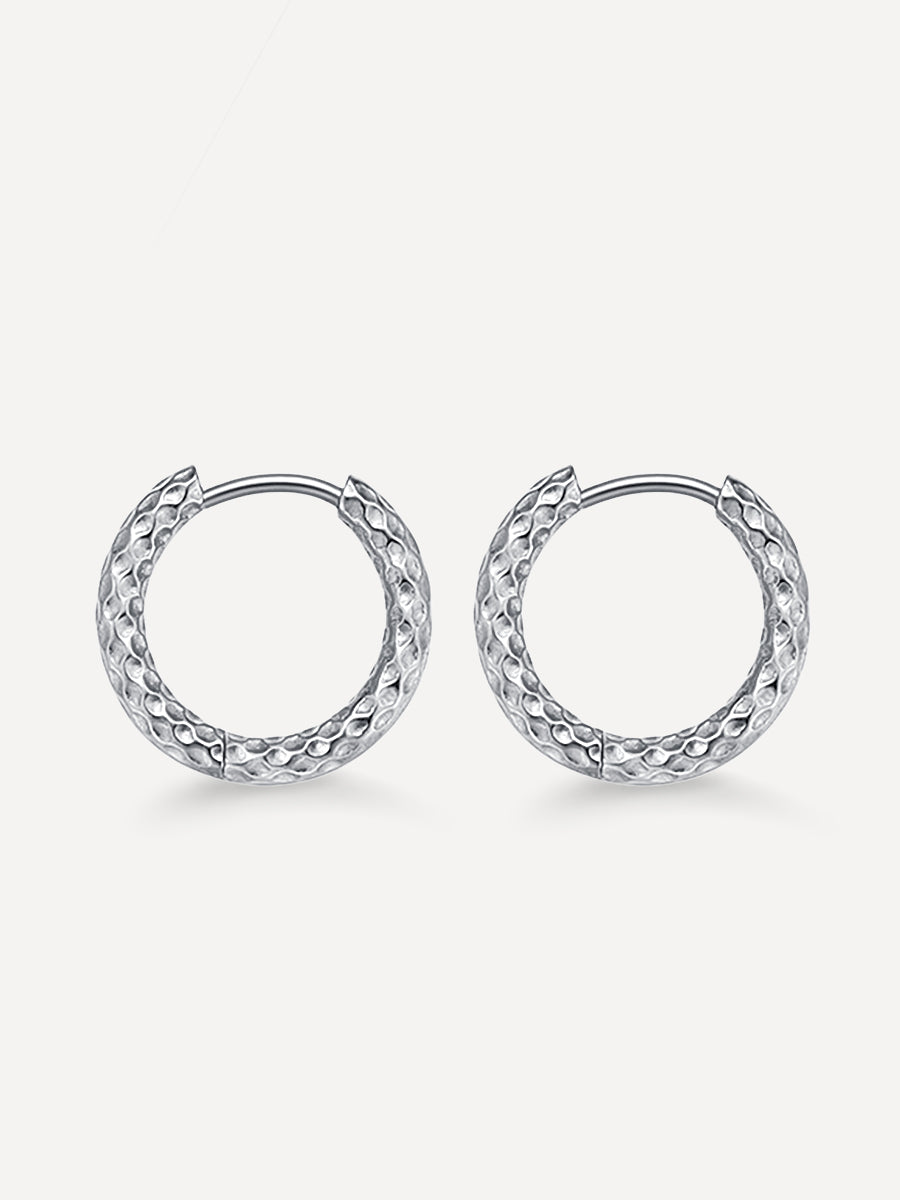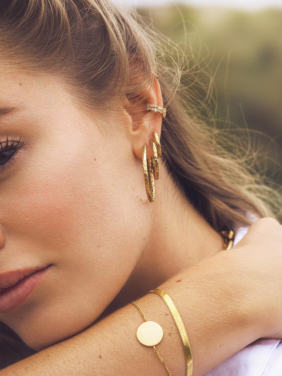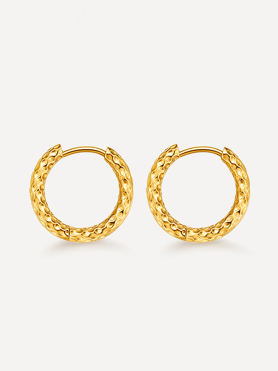 Our "Textured" hoop earrings are a dream come true! These round hoop earrings feature a unique surface texture reminiscent of a lunar landscape. These small hoop earrings are crafted from high-quality stainless steel, making them a durable everyday accessory. Hoop earrings are a timeless classic, perfectly complementing any look. The "Textured" hoop earrings are also truly on-trend pieces and can be wonderfully combined with other earrings. The earrings are available in two different versions: 18K yellow gold-plated and silver.